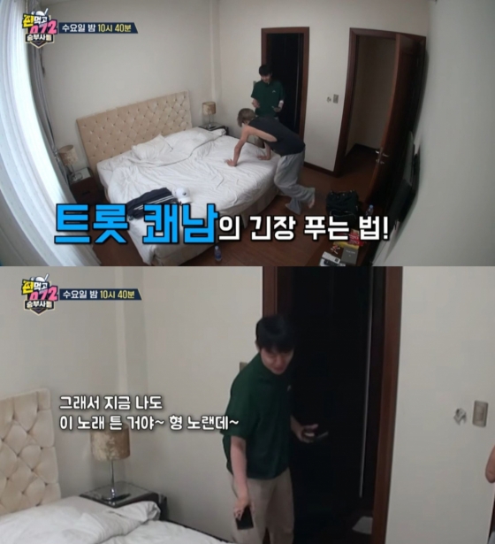 트로트 아이돌답게 아침부터 노래로 목을 풀고 긴장도 풀던 영탁은, 에릭을 위해 자신의 노래 '재잘대'의 '잇츠 올 라잇~ 오 예 별 걱정하지마' 라는 부분을 들려주며 긴장을 풀어줬다.
