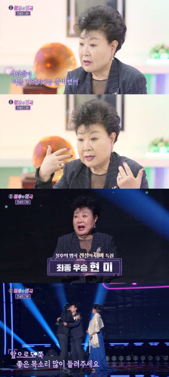 고 현미와 '불후'의 인연은 2014년, 2022년에 있었다. 2014년 '고 이봉조 특집'(불멸의 멜로디, 이봉조 특집) 편에 고 현미가 정훈희와 함께 전설로 출연한 바 있다. 또한 2022년 3월 12일 방송된 '불후'의 '전설의 디바 특집'에 출연했던 고 현미는 우승까지 차지했다.