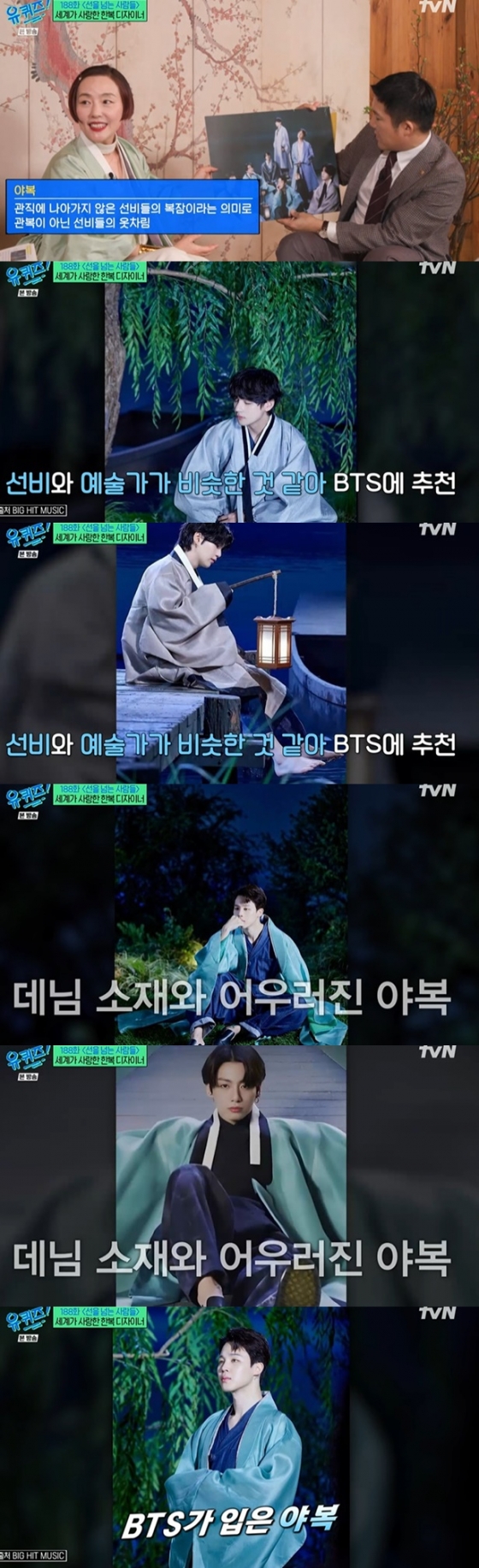 유재석이 "BTS도 김영진 씨의 한복을 입었다"고 했고, 김영진은 "선비들이 풍류를 즐기고 자연을 즐기면서 공부할 때 입는 '야복'을 (BTS가) 입었다. 예술가들과 가까워서 BTS에게 다양하게 표현해봤다"라고 말했다.