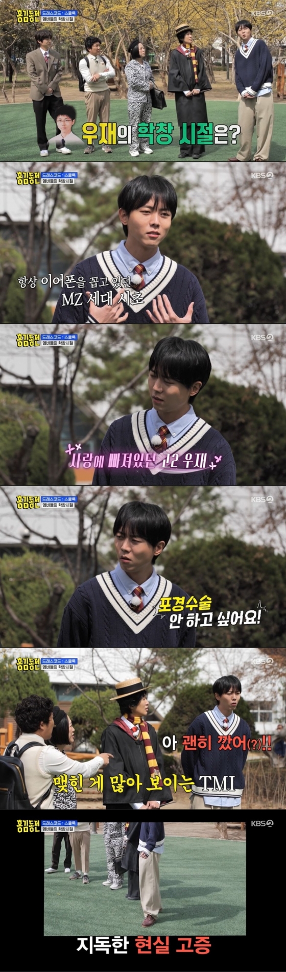 이날 '홍김동전' 멤버들은 스쿨룩을 입고 등장해 자신들의 학창 시절을 공개했다. 주우재는 "저는 진짜 특징이 없었어요. 저는 모범생도 아니었어요. 근데 이어폰은 늘 꼽고 있었어요"라며 학창 시절을 회상했다. 조세호는 "고등학교 때 여자친구 있었어요?"라고 물었고, 주우재는 "네 있었어요. 고2 때"라고 답했다. 이에 홍진경은 "그래 그분이랑 헤어져서 식음 전폐하고 맨날 울었다며"라며 지난 방송에서 한 이야기를 언급했다.