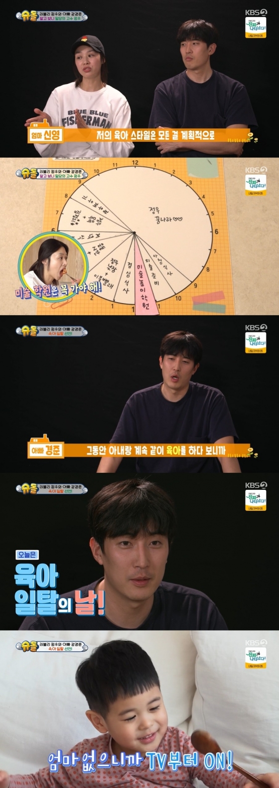 한편 두 사람은 전혀 다른 육아 방식에 티격태격하는 모습을 보였다. 계획형인 장신영은 강경준에게 "여보를 위해서 계획표를 짜놨다"라며 루틴을 공개했다.