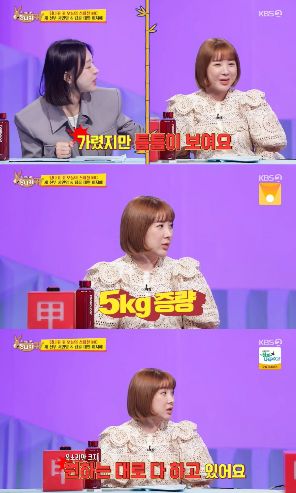 그는 "(결혼하니) 먹을 수 있는 친구가 있다. 밤에 족발 시켜 먹을 때 둘이 있으니 마음껏 시킨다. 안 좋은 건 5kg 쪘다"라며 "또 내가 긴다. 남편은 '목소리가 크지, 난 진다'라고 하지만 난 목소리만 크지 원하는 대로 잘 해준다. 남편이 가끔 피식피식 웃을 때가 있다. 그때마다 재수 없다"라고 전했다.
