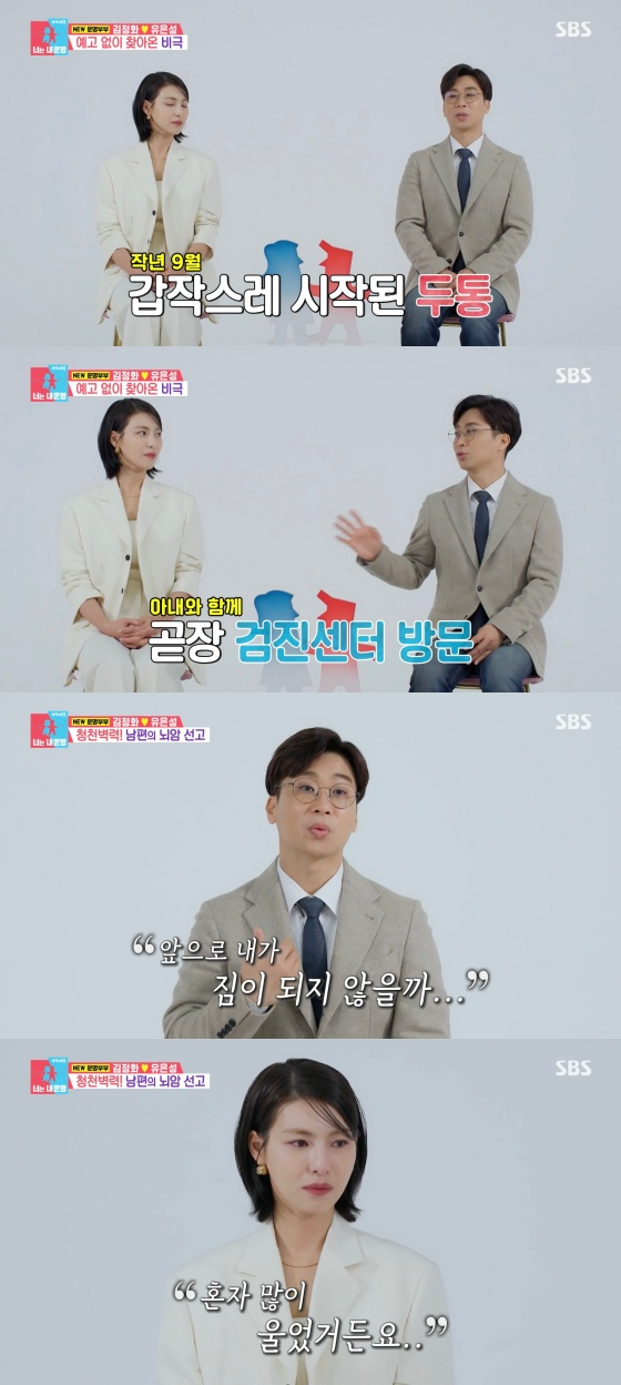 이날 김정화는 남편 유은성 암 투병 사실을 고백하며 눈물을 보였다. 유은성은 "병원에서 저등급 신경교종(뇌암)으로 보인다고 '심상치 않아서 큰 병원 가셨으면 좋겠다'했다. 그 찰나에 만감이 교차했다"라고 전했다. 김정화는 "다른 대학병원에서도 똑같은 소견이 나왔다"라며 뇌종양 판정을 받았다고 전했다.