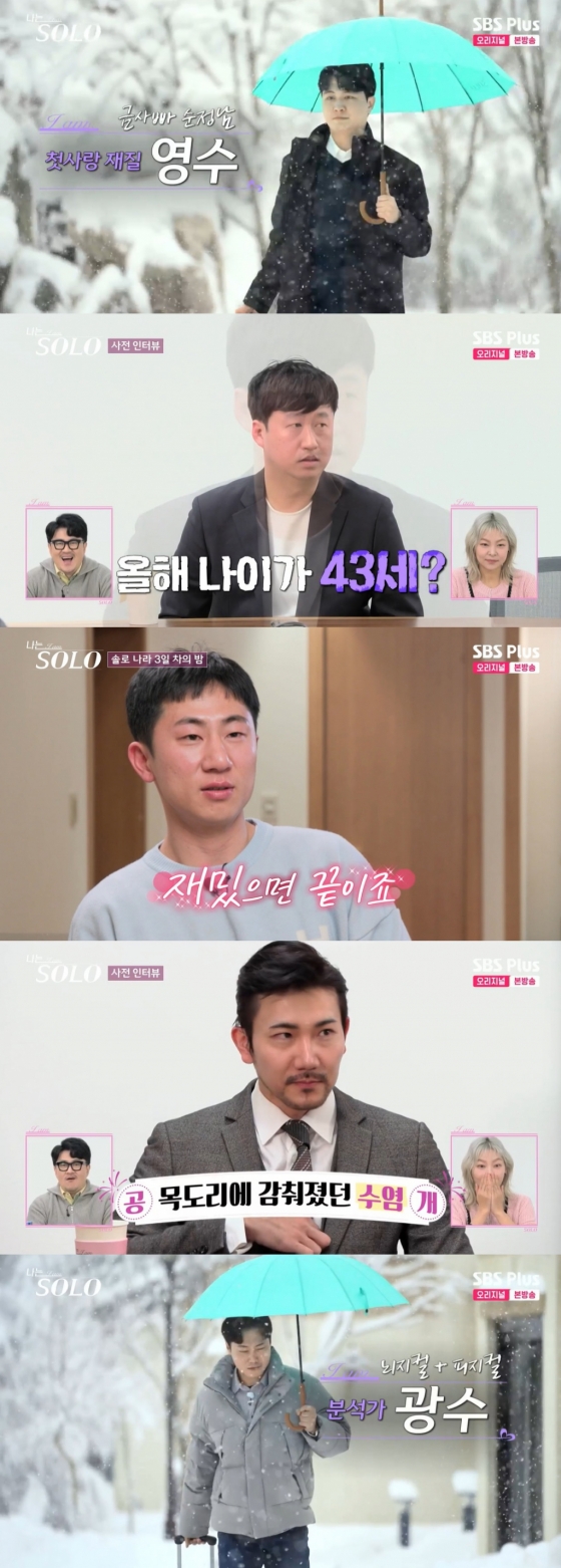 이날 '나는 솔로'에 처음으로 나타난 14기 출연진은 영수였다. 그는 "1년 동안 거의 100명 가까이 소개팅을 해봤다. 집에서 압박이 심하다. 고시 공부를 오래 했다. 행정고시 실패 후 35살에 늦게 현 회사에 입사했다. 고시 공부가 도박 같다. 총 7년 했다"라며 결혼이 늦어진 이유를 고백했다. '동안 이미지' 영수는 3일에 한 번꼴로 소개팅을 한 셈.