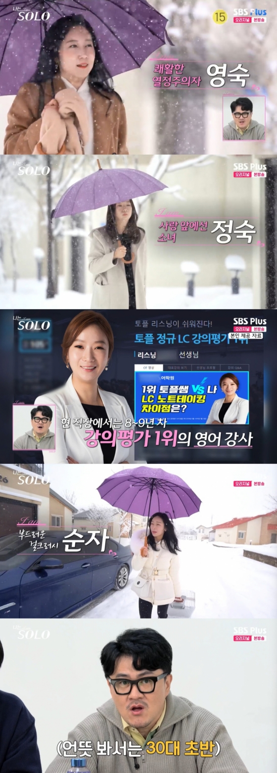14기 순자는 "현 직업 전에는 10년 넘게 경영 컨설팅 회사에서 경영 컨설턴트로 근무했다. 여자가 많이 없던 직업이다"면서 "선이나 소개팅을 한번도 해본 적이 없다. 틀에 박힌 걸 굉장히 좋아하지 않는다"라고 했다.