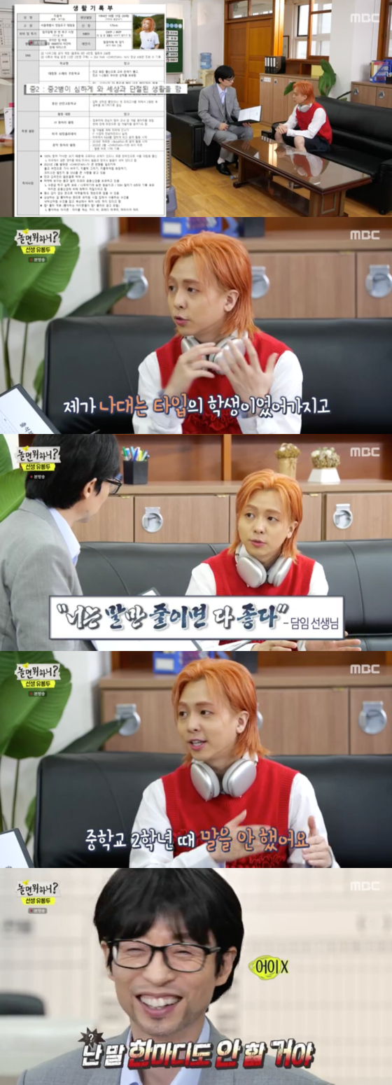 지올팍은 그러나 중학교 2학년 때는 중2병이 심하게 왔었다며 "담임 선생님이 '너는 말만 줄이면 좋다'고 하셔서 한 마디도 안했다"고 밝혀 웃음을 더했다. 지올팍은 "근데 2학기가 되니 더는 콘셉트를 유지하기 힘들더라. 바로 다 친구가 됐다"고 폭소를 유발했다.