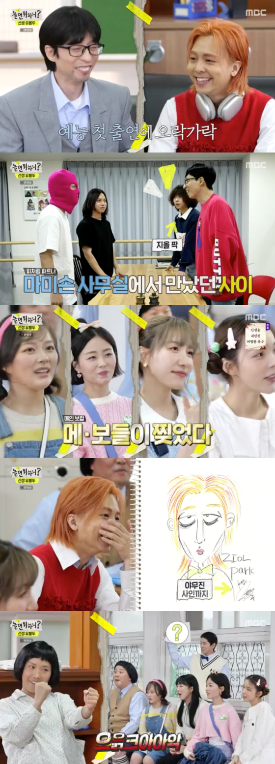 이날 유봉두의 교무실에는 전학생 지올 팍이 등장했다. 유봉두는 이에 4년 전 유고스타(유재석)의 콘서트에서 그를 만났던 것을 떠올리며 "'GD 느낌 난다', '되게 잘될 것 같다'고 생각했는데 잘 돼서 좋다"고 미소지었다. 지올 팍은 이에 "저도 오늘 잠 한숨도 못 잤다"며 4년만의 재회에 감격을 드러냈다. 지올 팍은 "예능적인 재능은 없다. 그저 선생님 보러 온 것"이라 덧붙여 웃음을 자아냈다.