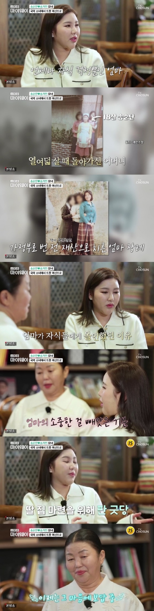 그러자 송가인은 "맞다. 그때 마음이 안 좋았다. 엄마께서 정말 짓고 싶던 굿당을 많이 손해를 보고 파셨다. 내 집을 마련해야 해서다. 마음이 정말 안 좋았다. 지금은 배 이상으로 해드리고 있다. 뿌듯하다"고 답했다.