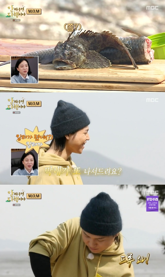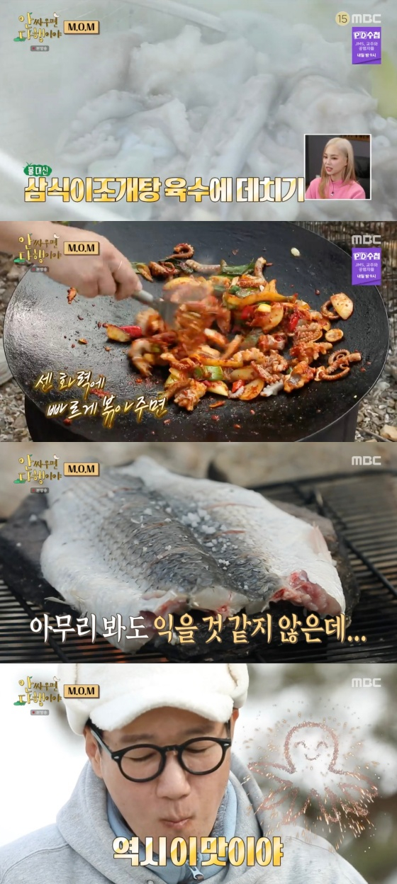 이후 지석진이 불에 달궈진 돌에 손질된 숭어를 올려 숭어구이를 요리했다. 지석진은 익지 않은 생선에 "돌을 빼야겠다"라고 제안했다. 이에 KCM이 "그냥 튀겨버리죠"라고 말했다. KCM은 끓인 기름을 숭어에 뿌리며 "제가 본 건 많다"라고 자랑했다.
