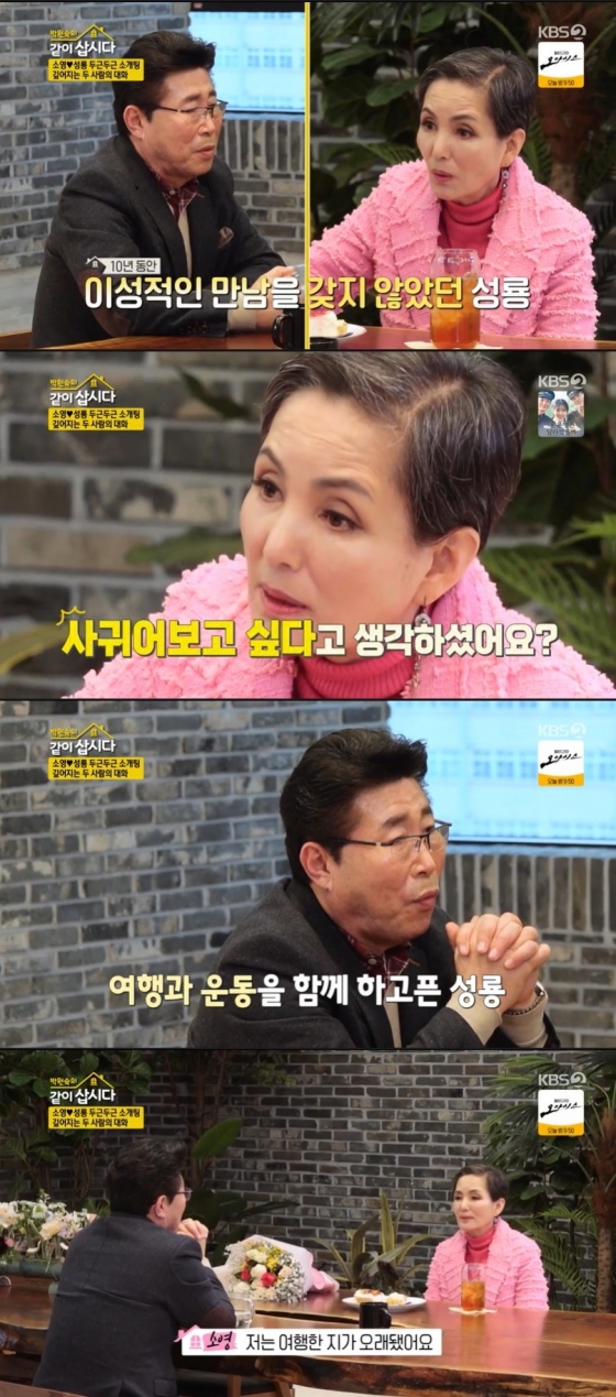 이어 안소영은 "저를 만나면 제일 하고 싶은 게 뭐예요? 굉장히 에너지가 많으실 것 같아"라고 물었고, 최성룡은 "여행도 다니고 운동도 같이하고. 이것저것 하고 싶은 게 많아요"라고 말했다. 또 안소영은 "저는 여행한 지가 오래됐어요. 우리 아이 낳기 전에요"라며 자신의 이야기를 털어놓는가 하면 최성룡이 가져온 기타에도 관심을 보이며 호감을 드러냈다.