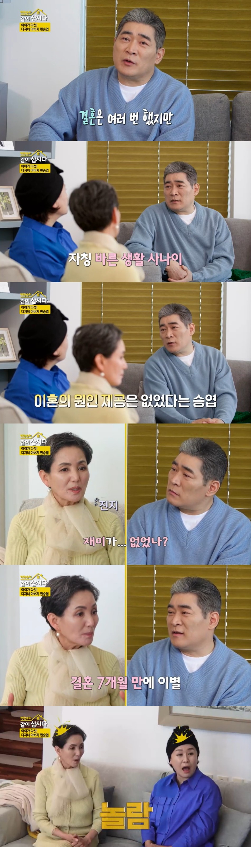 이에 안소영은 "재미가 없었나? 너무 바른 생활만 하니까"라고 물었고, 편승엽은 "근데 헤어지고 나서 또 찾더라"라며 의아하다고 말했다. 편승엽은 이어 가장 짧았던 결혼 생활은 7개월이라고 밝혀 자매들의 놀라움을 자아냈다.