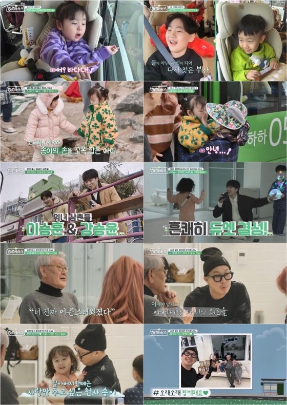 그런가 하면 하하가족은 '영도해녀촌'에서 특별한 인연들을 쌓았다. 송이가 동갑내기 친구를 만나 다사다난한 다섯 살 인생살이를 나누며 소울메이트로 거듭나는가 하면, 다음 여행지로 떠나던 하하가족이 앞서 만난 해녀 어르신을 탑승객을 다시 만난 것. 버스 안에서 애창곡도 부르고, 도란도란 담소도 나눈 하하가족과 해녀 어르신은 짧은 시간이지만 돈독한 정을 나눠 보는 이의 가슴을 찡하게 했다. 특히 어르신과 정이 많이 든 송이는 작별의 아쉬움에 눈물을 왈칵 쏟는가 하면, 떠나는 뒷모습에 "건강하세요! 안녕!"이라고 끝없이 인사를 해 뭉클함을 더했다.