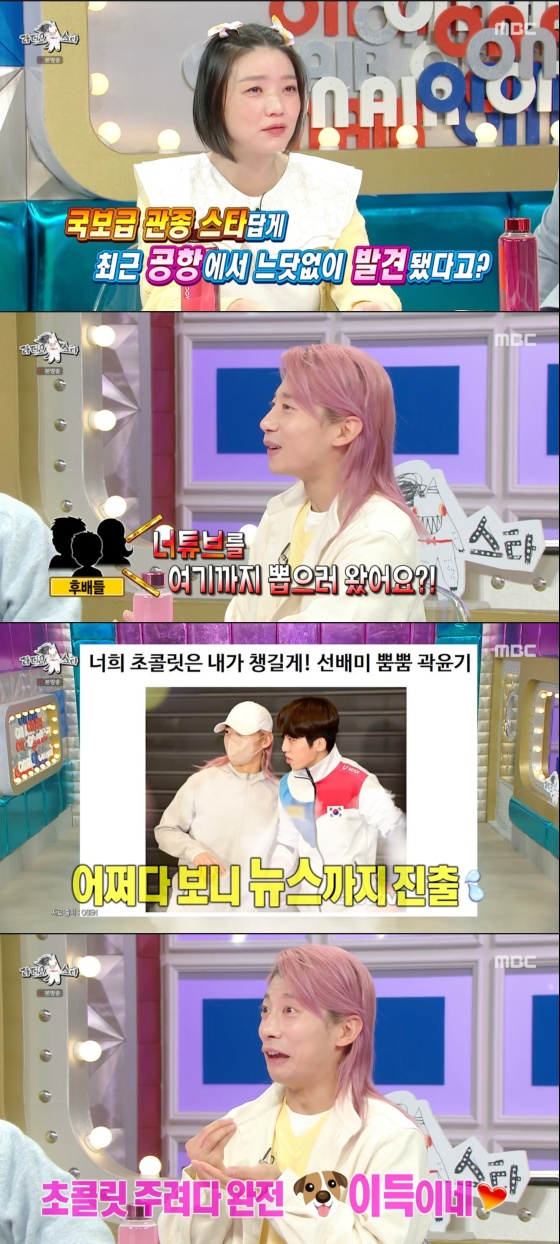 이날 MC 안영미는 곽윤기에 "국보급 관종 스타답게 최근 공항에서 느닷없이 발견됐다고"라고 물었다. 곽윤기는 "국가 대표팀이 국제 대회를 마치고 오는 날이 밸런타인데이었다. 경기 뛰고 왔으니 받을 사람이 없을 거라고 생각해서 '나라도 챙겨줘야겠다'해서 직접 만든 초콜릿을 만들어 공항으로 마중 갔다"라고 말했다.