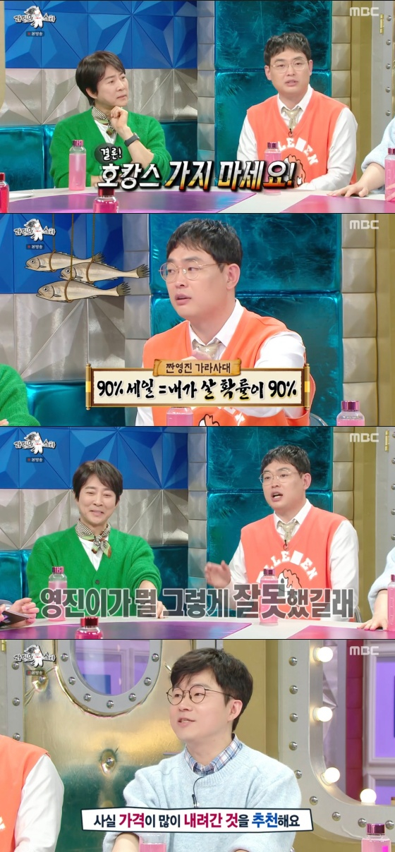 이후 유세윤이 또 다른 사연을 읽었다. 유세윤은 "눈독 들인 패딩 40% 할인 중인데 살까요 말까요"라고 물었다. 박영진은 "세일 60%, 80%는 세일이 아니다. 내가 살 확률이다"고 말했다. 박영진은 "'사장님이 미쳤어요?' 사장님 멀쩡하다. 미친 건 나다"라고 말해 웃음을 안겼다.