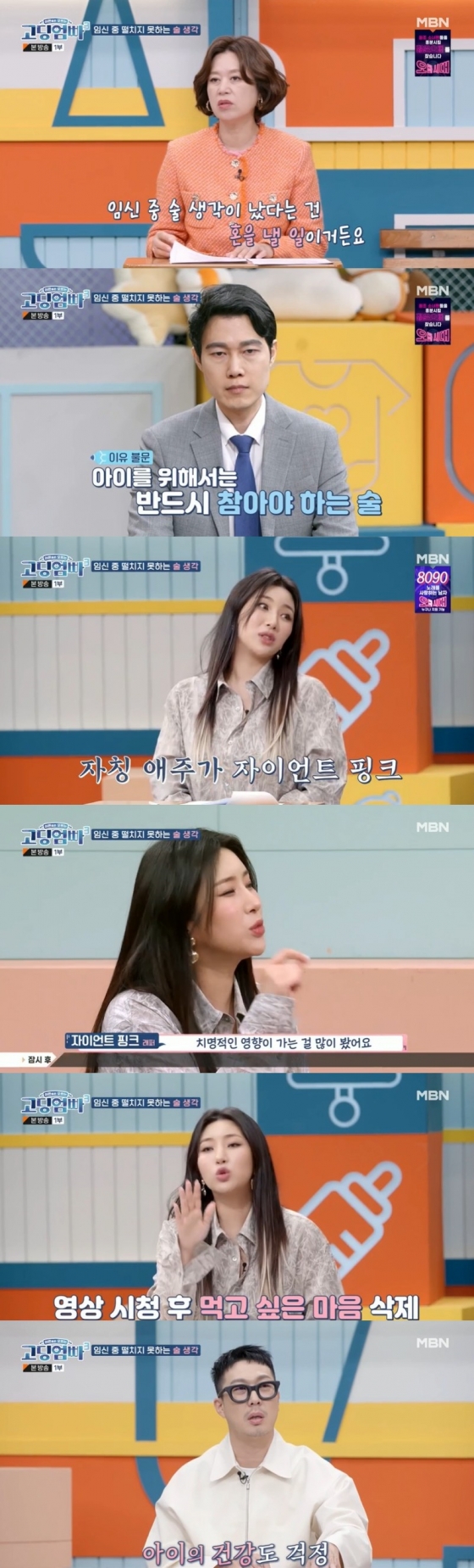 이날 게스트로 출연한 래퍼 자이언트 핑크는 "저도 애주가에요. 술을 좋아하긴 하긴 하거든요. 친구들이 다 술 먹고 놀고 있는데 저는 아이를 임신하고 있을 때 우울함이 생겼어요. 저는 그때 유튜브로 영상을 많이 봤어요. 술이나 커피를 마시면 아이가 어떻게 되는지를 보다 보니까 그런 것들을 보기도 싫더라고요"라며 자신의 경험을 이야기했다.
