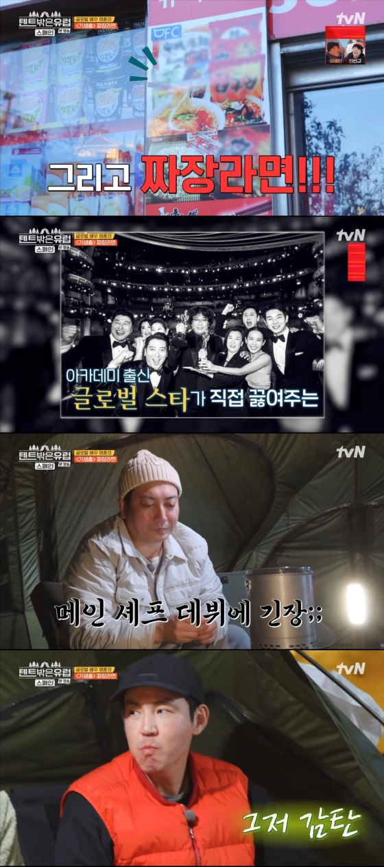 27일 방송된 tvN 예능프로그램 '텐트 밖은 유럽 - 스페인 편'회에서 박명훈이 자신이 출연했던 영화 '기생충'에서 화제가 되었던 짜장라면을 요리했다.