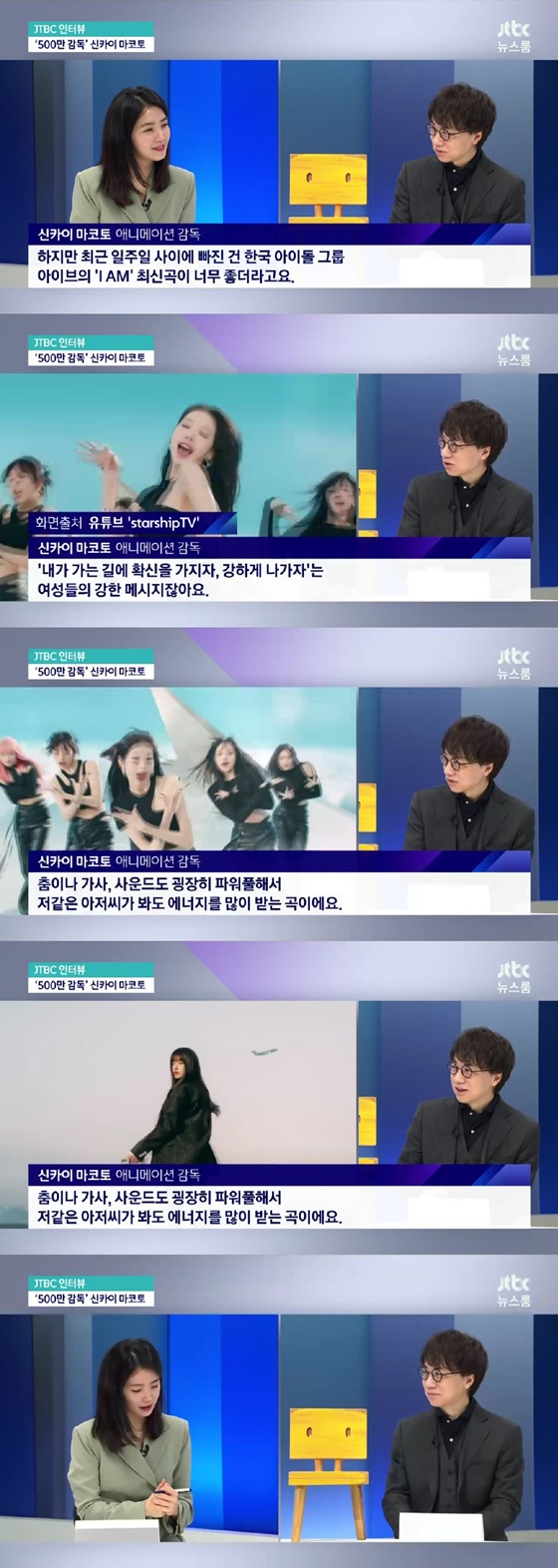 이날 신카이 마코토 감독은 "최근 일주일 사이에 한국 아이돌 그룹 아이브 '아이엠'(I AM)을 무한반복해 듣고 있다"고 말했다.