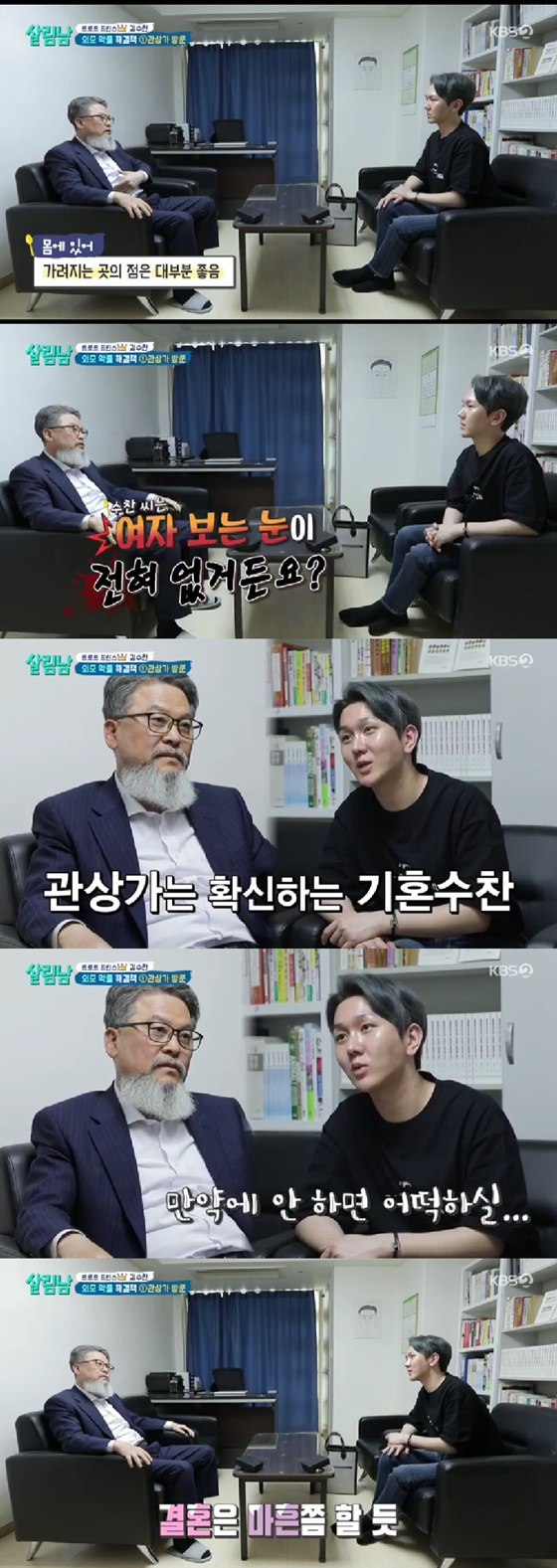 김수찬이 "만약 결혼 생각이 없다면 어떻게 되는 거냐"고 되묻자 관상가는 "당신은 결혼을 무조건 한다. 무조건 결혼한다. 결혼 안 할 얼굴이 아니다. 결혼은 마흔쯤 할 것"이라고 확신했다.