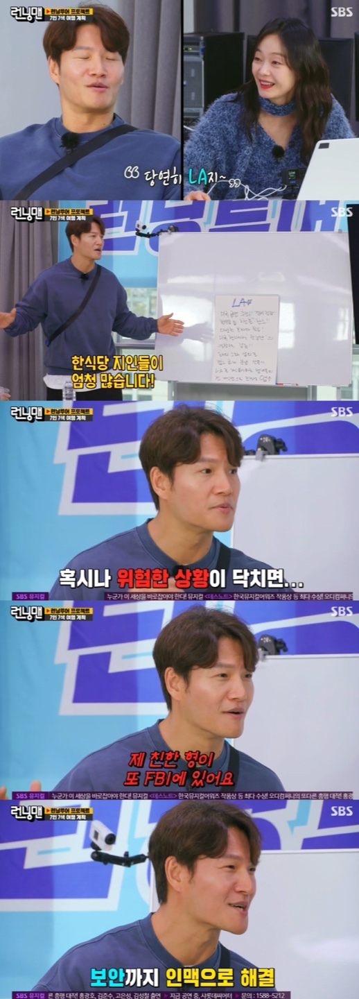 또한, "혹시나 위험한 상황이 닥치면 제 친한 형이 FBI에 있다"라며 LA의 화려하고 다양한 인맥을 자랑했다. 그러나 FBI 지인에 대해서는 멤버들이 믿지 않는 표정을 보이자 김종국은 "진짜로 진짜다"라며 결백한 모습을 보였고, 평소 김종국과 절친한 하하가 "나도 봤다. 전화번호도 있다"라고 거들어 보는 이들로 하여금 놀라움을 자아냈다.