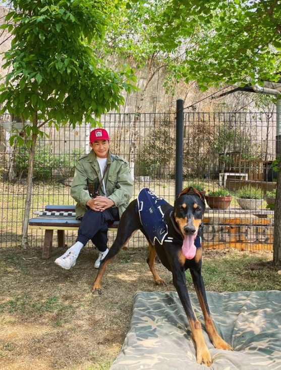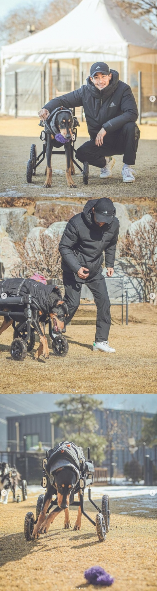 공개 된 사진 속 배정남은 자신의 다리 힘으로 혼자 우뚝 서 있는 벨의 뒤에 앉아 흐뭇한 표정으로 반려견을 바라보고 있다.