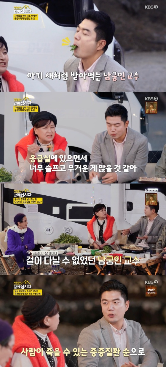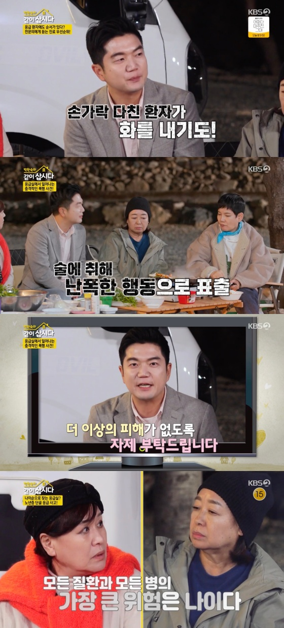 안문숙은 남궁인에 "뉴스에서 보면 응급실에서 환자분이 화를 못 참고 폭행을 가하고 그런 것들이 많다"며 안타까워했다. 남궁인은 "거의 술 때문이다. 저희가 가장 폭행을 많이 당하는 과다. 안 맞아 본 사람이 없다. '내 아들 왜 안 봐주냐'하며 난폭하게 행동한다"고 전했다.