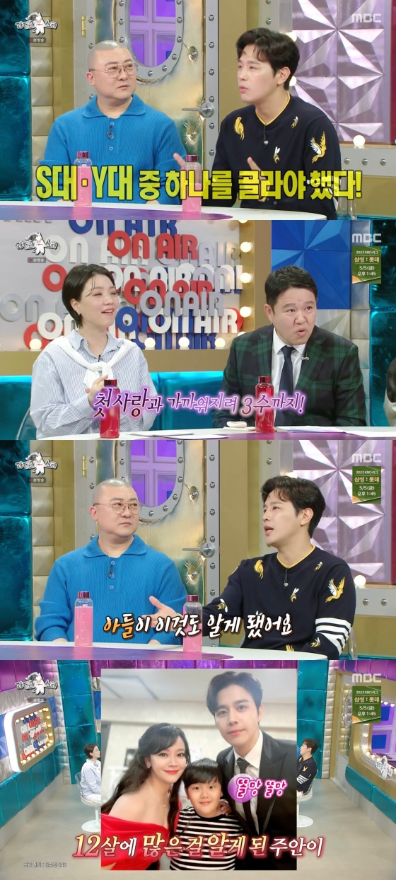 손준호는 "첫사랑이 이대에 다녔다. 그래서 3수로 신촌을 갔다. 아들이 그것도 알게 됐다. '아빠 첫사랑은 이대구나. 그래서 엄마가 이대를 별로 좋아하지 않구나'라고 하더라"고 전했다. MC 김구라는 손준호에 "주안이가 몇 살이지?"라고 물었다. 손준호는 "벌써 5학년이다"라고 답했다.