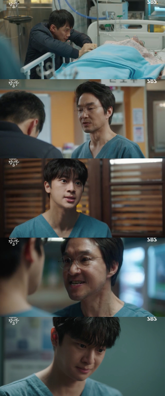 '김사부3' 배우 한석규가 이신영을 따끔히 혼냈다. 안효섭은 되려 격려를 전했다.