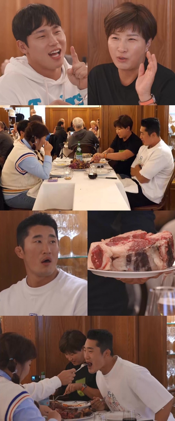 '뭉뜬 리턴즈-이탈리아 편' 박세리, 김동현, 김민경, 윤성빈이 스테이크 22인분을 해치운다.