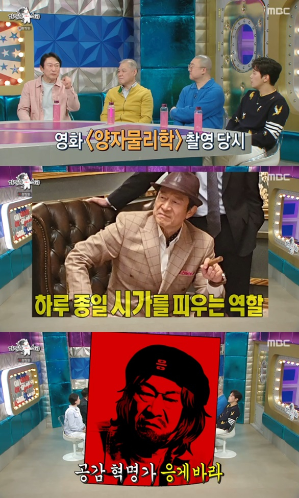 이어 "영화 '양자물리학' 대본을 받았는데 하루 종일 내가 (역할에서) 시가를 피고 있다. 하루 종일 아침부터 밤까지 시가를 피워서 하루 500만 원 정도 들어갔을 거다.두 달 동안 매일 현장에서 피우다 보니까 그때 내가 체 게바라를 이해됐다"고 말했다.