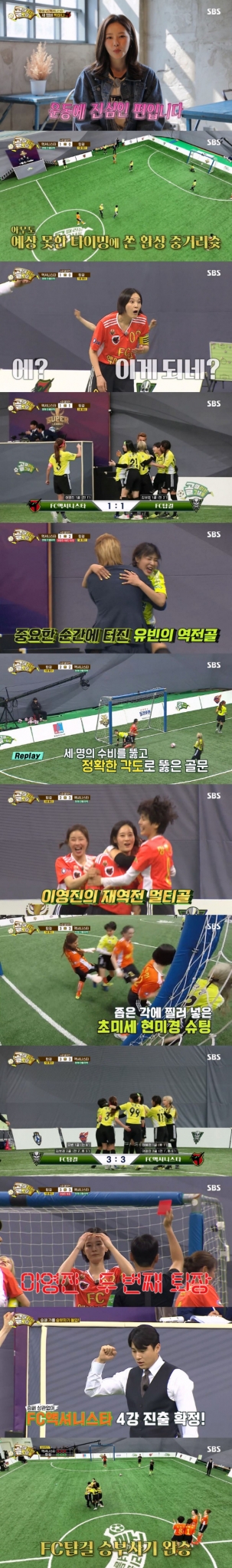 4강 진출 팀은 '액셔니스타', '구척장신', '불나방', '월드클라쓰'로 확정되었고, 지난 시즌 우승팀인 '탑걸'은 4강 진출이 무산되었다. 하지만 김병지 감독의 연패 사슬을 끊기 위해 팀원 모두 마지막 승부차기에 집중했고, 아유미의 연속 선방 끝에 3대0으로 승부차기 승리를 가져왔다. 경기 후 '탑걸'의 골키퍼 아유미는 승리에도 불구하고 4강행이 불발된 아쉬움에 눈물을 펑펑 흘려 안타까움을 자아냈다.