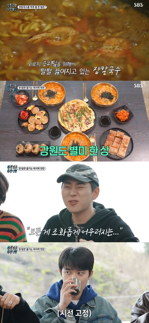 11일 오후 방송된 SBS 예능프로그램 '수학 없는 수학여행'에서 디오, 지코, 크러쉬, 잔나비 최정훈, 이용진, 양세찬이 강원도 속초 팬사인회 대결 후 만찬을 즐기는 모습이 담겼다.