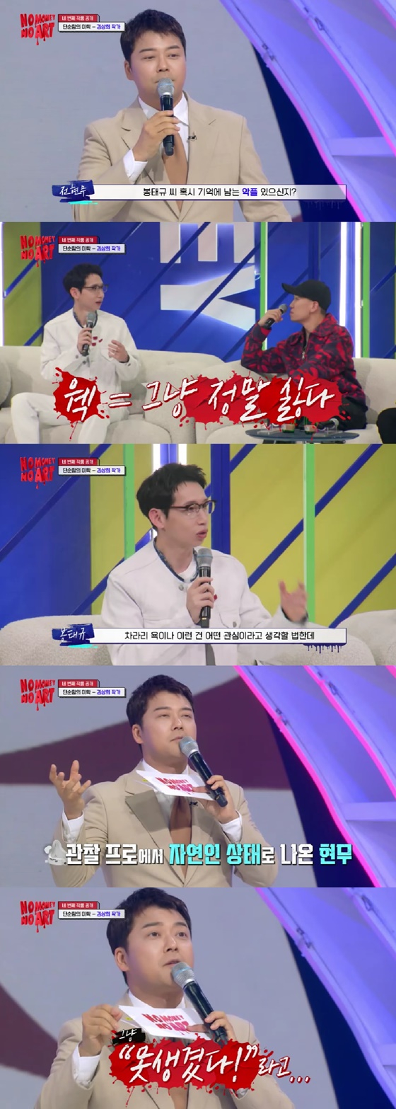 지난 11일 오후 방송된 KBS 2TV 예능 프로그램 '노머니 노아트'에서는 악플에 대해 짧은 대화를 나누는 봉태규, 전현무의 모습이 그려졌다.