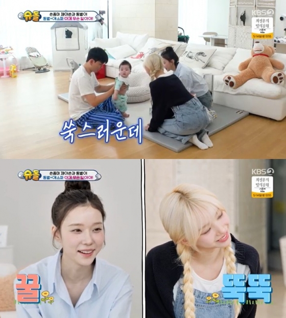 12일 오후 방송된 KBS 2TV 예능 프로그램 '슈퍼맨이 돌아왔다'(이하 '슈돌')에서는 걸 그룹 에스파 멤버 윈터와 카리나가 인테리어 디자이너 제이쓴의 육아를 돕는 모습이 그려졌다. 혹독한 육아를 경험한 윈터와 카리나는 제이쓴의 아들 '똥별이'가 잠이 들자, 꿀 같은 휴식을 즐겼다.