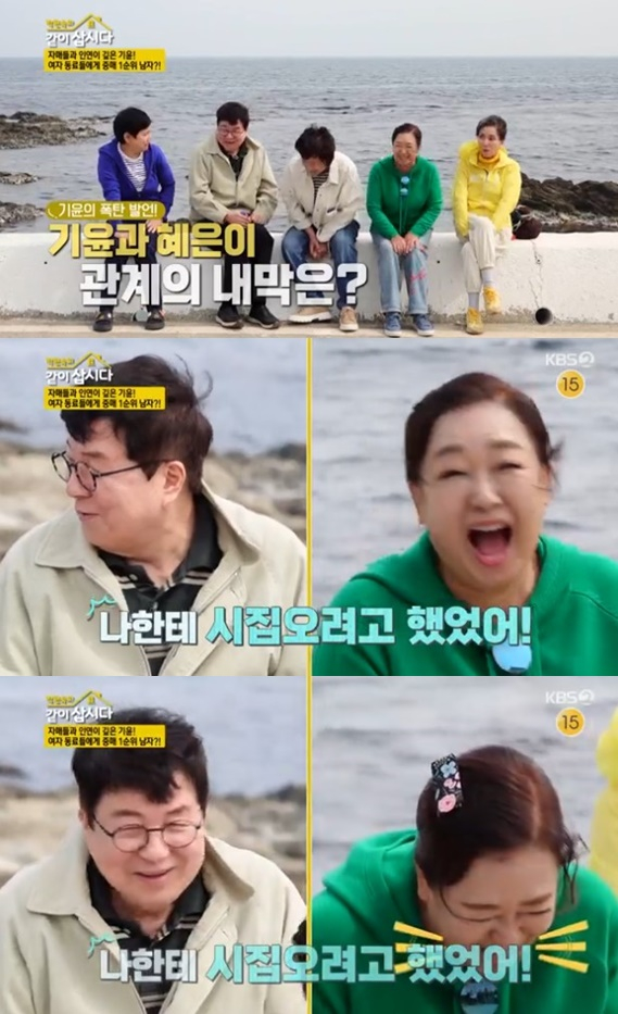 멤버들은 송기윤에게 혜은이와의 인연을 물었다. 이에 송기윤은 "(혜은이) 나한테 시집오려고 했잖아"라며 웃음을 지었다. 이에 혜은이는 "그게 아니라, 방송국 복도에서 오다가다 마주쳤던 송기윤에 대한 이미지가 좋았다. 부드럽고 사람이 좋아 보여서 항상 마음속으로 주변에 중매해주고 싶었다"고 고백했다.
