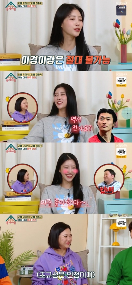 그러자 송은이는 "미주가 러브라인 유발자라는 말이 있다. 한해, 유병재, 허웅, 조규성 중 아무도 러브라인 가능성이 없나?"라는 질문에 미주는 아무도 가능성이 없다며 부정했지만 결국 조규성이 이상형이라고 수줍게 밝혔다