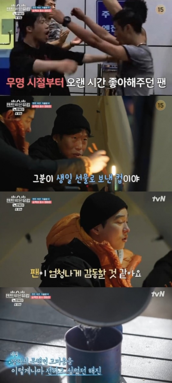 그는 컵을 한참 바라보다 멤버들에게 "무명 시절인 '주유소 습격 사건' 때부터 오랜 팬이 있다"며 말문을 열었다. 그러면서 "이 컵은 그분이 생일선물로 일본에서 보내준 컵이다. 근데 매년 생일 때마다 손 편지를 보내오는데 '텐트 밖은 유럽'에서 내가 이 컵을 사용하는 걸 보고 너무 좋았다고 전해주더라. 이 컵이 그런 컵이다"며 감동 일화를 공개했다.