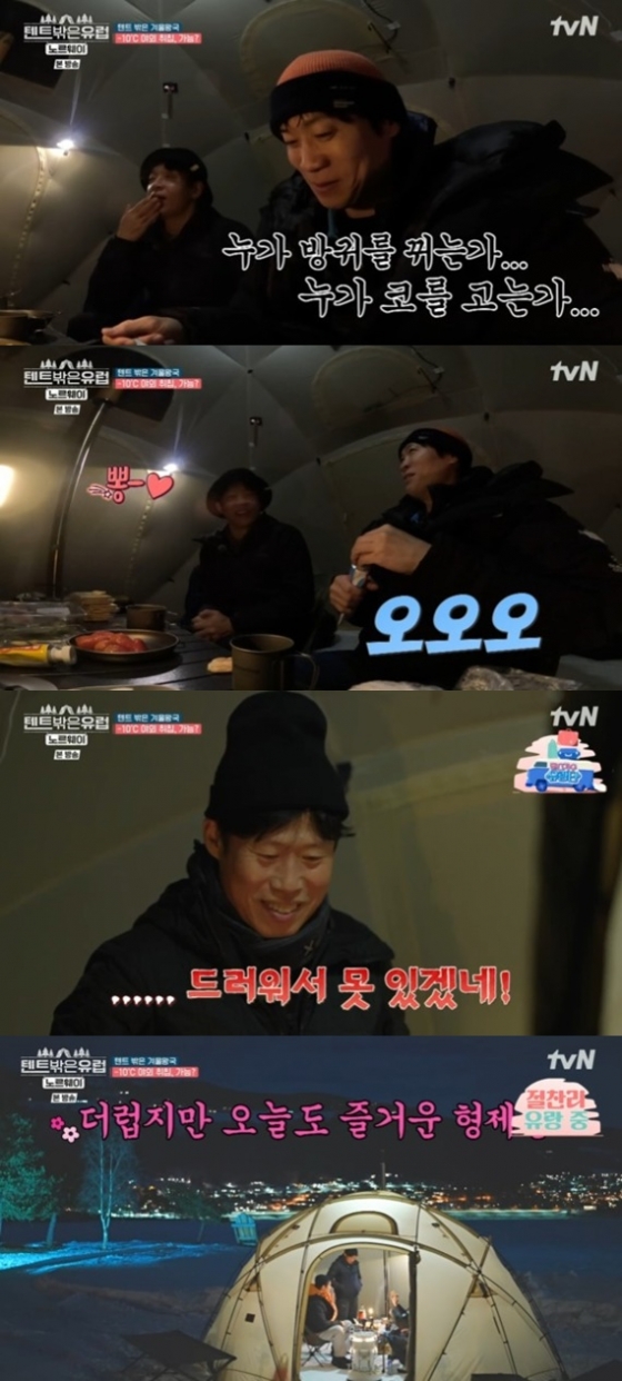 18일 방송된 tvN 예능 프로그램 '텐트 밖은 유럽 노르웨이 편'에서는 스트론다 호수 캠핑장에서 하루를 보내게 된 유해진, 진선규, 박지환, 윤균상의 모습이 담겼다.