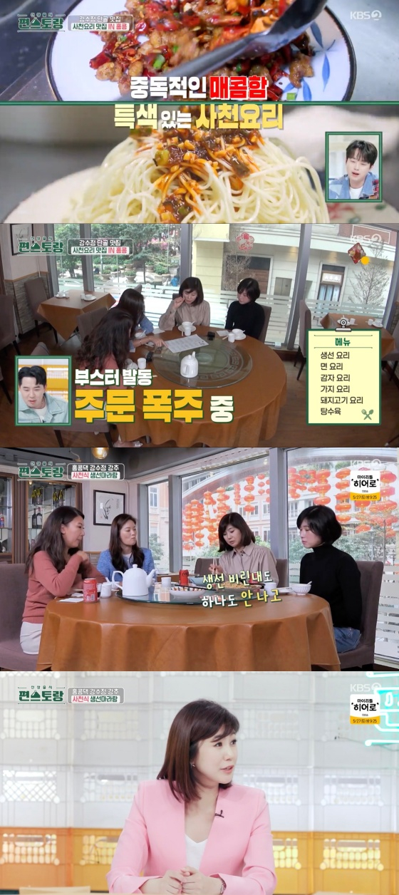 19일 방송된 KBS 2TV 예능프로그램 '신상출시 편스토랑'에서 강수정이 홍콩 사천요리 맛집에서 미식 모임을 가졌다.