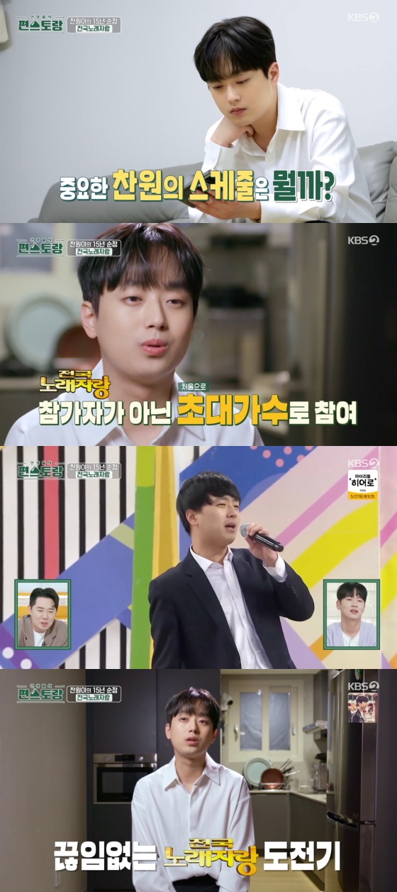 19일 방송된 KBS 2TV 예능프로그램 '신상출시 편스토랑'에서 이찬원은 15년간 자신이 출전했던 '전국노래자랑'의 초대가수로 초청됐다고 알렸다.