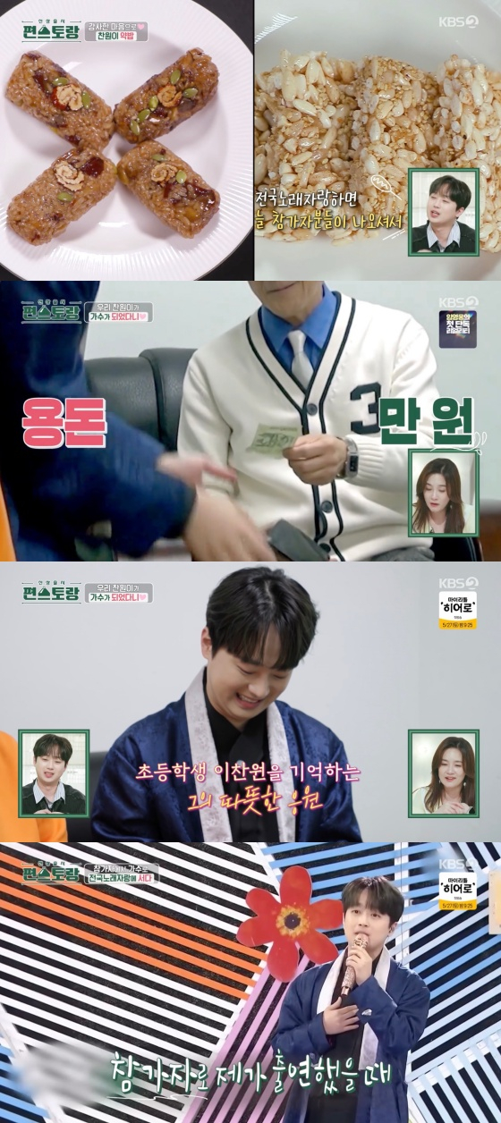 이날 이찬원은 "빈손으로 갈수 없지"라며 약밥을 요리했다. 이찬원은 "약밥이 되는 동안에 여기에"라며 쌀강정을 만들기 위해 프라이팬과 쌀 과자를 꺼내 들었다. 15년간 '전국노래자랑'의 참가자였던 이찬원은 초대 가수 초청에 "말로 표현할 수 없는 그런 감정이 있다"고 말했다.