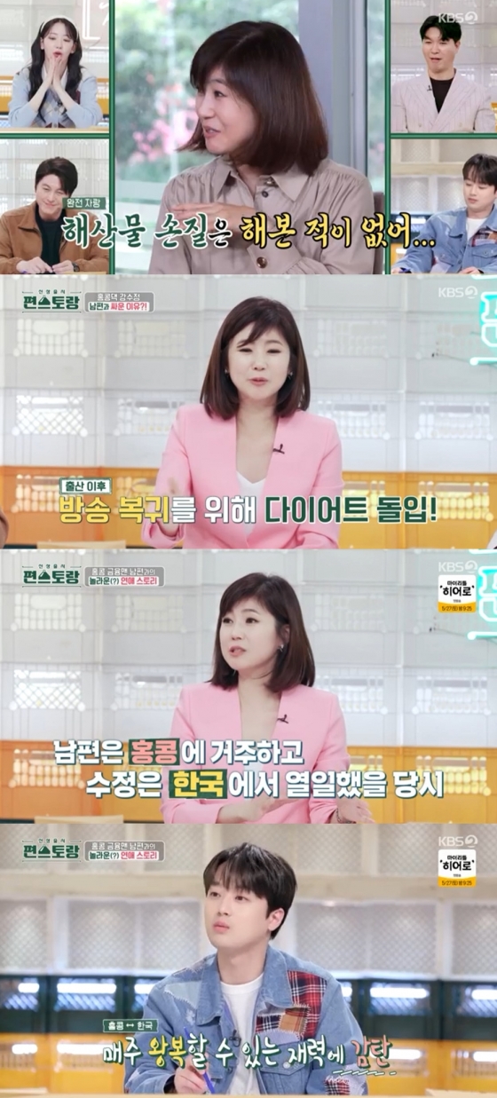 19일 방송된 KBS 2TV 예능프로그램 '신상출시 편스토랑'(이하 '편스토랑')에서는 남편 후배의 아내들과 단골 맛집으로 향한 강수정의 모습이 그려졌다.