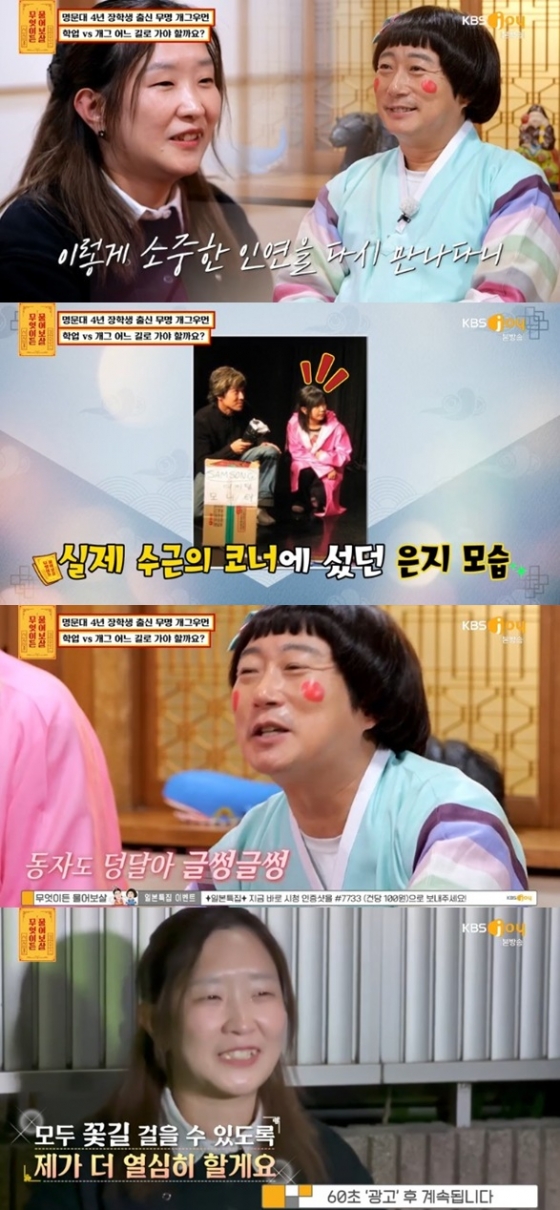 이어 그녀는 "하지만 TV에는 아주 가끔 출연하고 여전히 무명 개그우먼이다. 하지만 공부 쪽에 재능이 있어 박사 과정을 권유받았다"며 학업과 개그우먼 꿈 사이의 고민을 전했다.