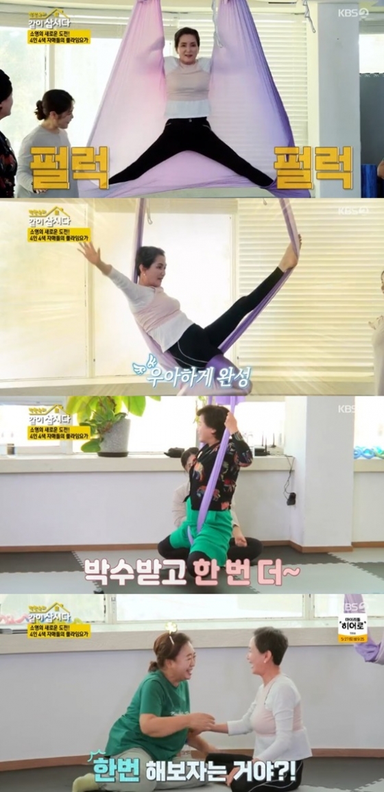 23일 방송된 KBS 2TV 예능 프로그램 '박원숙의 같이 삽시다 시즌3'에서 네 자매(박원숙, 혜은이, 안소영, 안문숙)가 플라잉 요가를 배우는 모습이 담겼다.