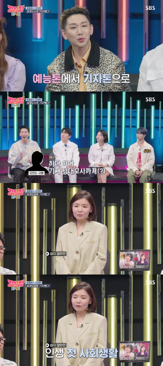 강호동은 "기자톤은 어떻게 잡았냐"라며 궁금해했다. 조정린은 "사람들이 '하다 하다 기자 성대모사까지 한다'고 그랬는데 그것도 맞다. 방법을 모르니까 흉내 내기부터 했다"고 전했다.