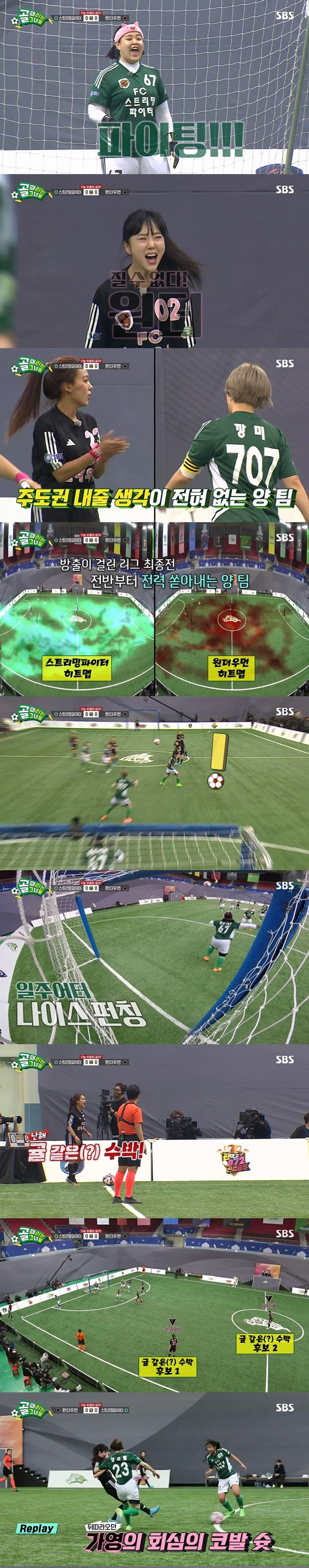 원더우먼은 에이스 김가영이 빠진 상태에서, 스밍파는 이수날이 벤치로 빠진 상태에서 전반전이 시작됐다. 원더우먼이 2점 차 이상으로 승리 시 잔류가 결정되는 FC발라드림(이하 발라드림)은 관람석에서 원더우먼을 열렬히 응원했다. 첫 승격이 간절한 두 팀의 경기인만큼 초반부터 치열한 공방전이 이어졌다. 스밍파는 활발한 소통으로 분위기를 주도해나갔고, 원더우먼도 이에 지지 않고 서로를 크게 격려하는 모습에 지켜보던 김병지 감독은 "이게 축구하는 거냐, 파이팅 싸움하는 거냐"고 감탄했다.