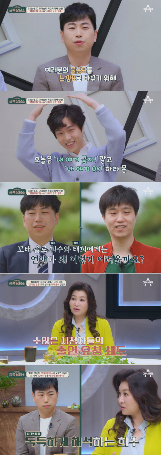 26일 오후 방송 예정인 채널A '오은영의 금쪽상담소'에는 '나는 SOLO'(이하 '나는 솔로') 모태솔로 편에 출연해 화제를 모았던 이희수(광수)&정태희(영수)가 출연한다.