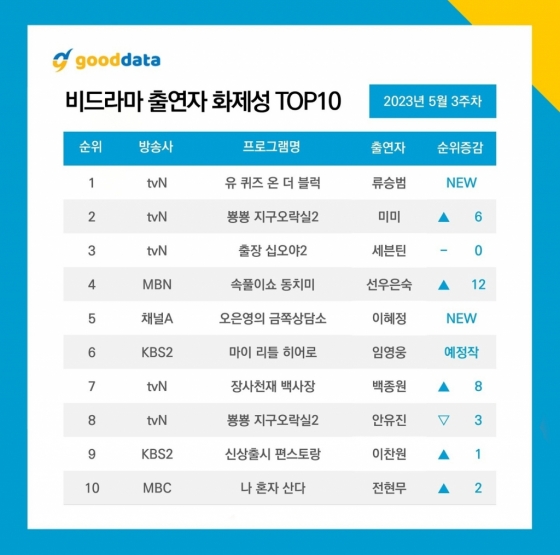 이찬원은 굿데이터코퍼레이션이 최근 발표한 2023년 5월 3주 TV 비드라마 화제성 순위에서 KBS 2TV '신상출시 편스토랑'으로 9위에 올랐다.