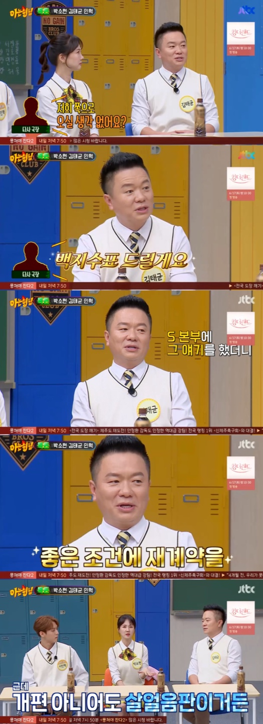 '아는 형님' 김태균이 타 방송국으로부터 라디오 DJ 이적 제의를 받았다고 털어놨다.