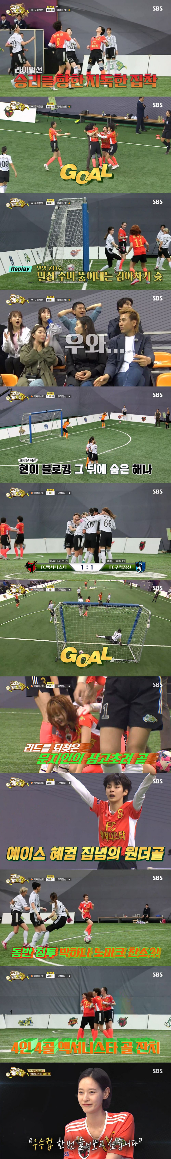 다시 원점으로 돌아간 경기에 양팀의 공격은 더욱 팽팽하게 맞붙었다. 추가골을 넣는 팀이 분위기를 지배하게 되는 상황에 양팀 모두 한 점 득점에 열을 올렸다. 꽉 막혔던 승부의 혈은 후반 5분에 뚫렸다. 정혜인의 패스를 받은 문지인이 완벽한 원터치 슈팅으로 시원하게 골망을 갈랐고, 액셔니스타가 다시 한번 리드를 가져왔다. 액셔니스타 승리에 발판을 놓는 이 장면은 분당 최고 시청률 7.7%를 기록하며 '최고의 1분'을 차지했다.