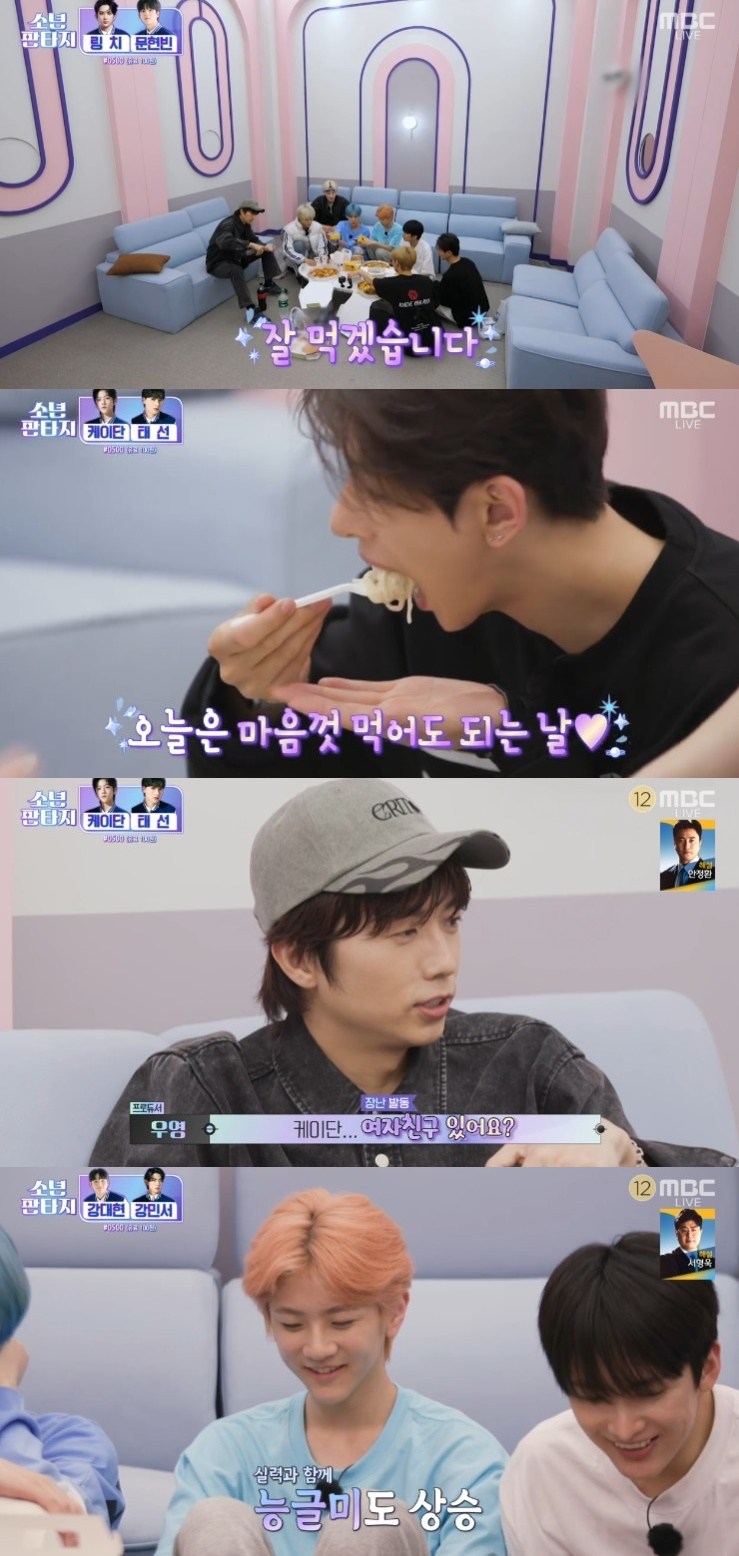 식사하고 있는 멤버들에 장우영은 "이제 팬분들도 많이 생기지 않았느냐, 플랜카드 같은 거 엄청 많이 들고 오더라"고 말하자 케이단은 "나는 없다"며 의기소침한 모습을 보였다. 장우영은 "케이단 여자친구 있어요?"라고 묻자 케이단은 "이 프로그램(소년판타지)?"이라고 말해 웃음을 자아냈다.